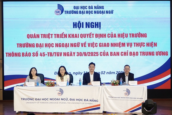 Ngày 11/02/2026, Trường Đại học Ngoại ngữ, Đại học Đà Nẵng tổ chức Hội nghị quán triệt và triển khai Quyết định của Hiệu trưởng về việc giao nhiệm vụ thực hiện Thông báo số 45-TB/TGV của Ban Chỉ đạo Trung ương. Hội nghị có sự tham dự của lãnh đạo các đơn vị, cán bộ, giảng viên và người lao động toàn trường, thể hiện quyết tâm chính trị cao và tinh thần chủ động chuyển đổi trong bối cảnh tự chủ đại học ngày càng sâu rộng.