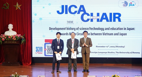 Chiều ngày 17/11/2025, tại Hội trường A, Trường Đại học Ngoại ngữ, Đại học Đà Nẵng đã tổ chức thành công chương trình JICA Chair Việt Nam 2025 với sự tham dự của Phái đoàn Cơ quan Hợp tác Quốc tế Nhật Bản (JICA), các chuyên gia, đại diện ngoại giao, cán bộ giảng viên và đông đảo sinh viên. Sự kiện không chỉ là dịp giao lưu học thuật quốc tế mà còn đánh dấu một bước tiến quan trọng trong hợp tác giáo dục, mở rộng cơ hội phát triển nguồn nhân lực chất lượng cao, qua đó khẳng định vai trò tiên phong của Nhà trường trong tiến trình hội nhập toàn cầu.
