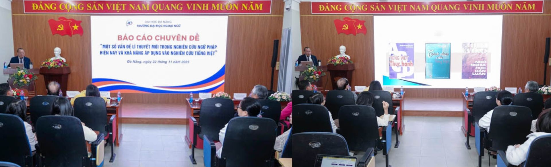 Ngày 22/11/2025, Trường Đại học Ngoại ngữ, Đại học Đà Nẵng tổ chức chuỗi báo cáo chuyên đề dành cho giảng viên và học viên sau đại học, với sự tham gia của báo cáo viên, GS.TS. Nguyễn Văn Hiệp - Nguyên Viện trưởng Viện Ngôn ngữ học, Viện Hàn lâm Khoa học Xã hội Việt Nam, Chủ tịch Hội đồng Khoa học và Đào tạo, Trường Ngoại ngữ - Du lịch, Đại học Công nghiệp Hà Nội.