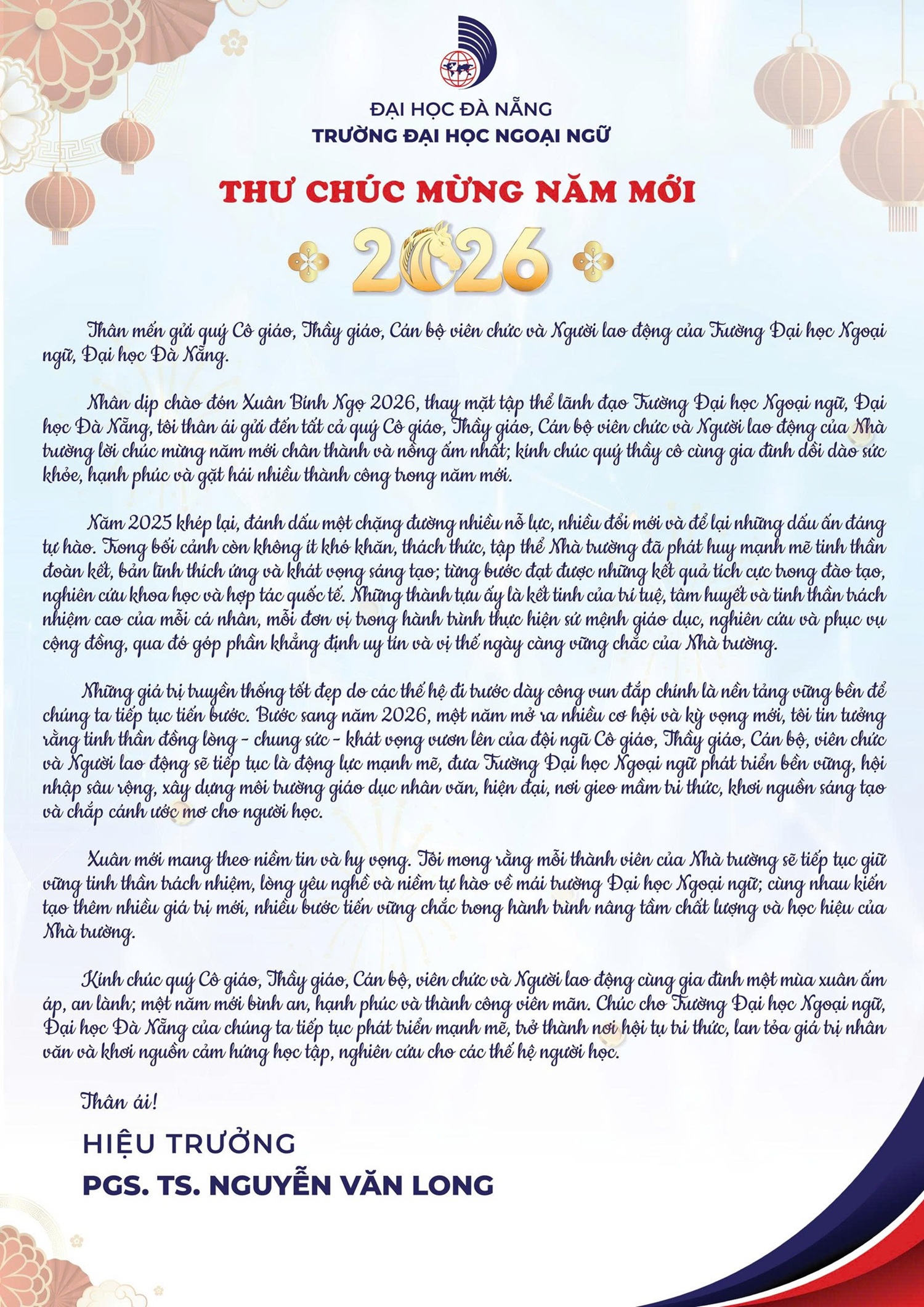 Thư chúc mừng năm mới 2026 của Thầy Hiệu trưởng Trường Đại học Ngoại ngữ, ĐHĐN gửi quý Cô giáo, Thầy giáo, Cán bộ, viên chức và Người lao động.