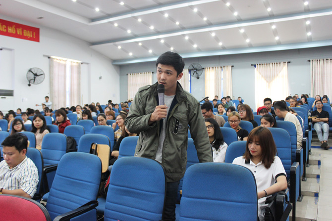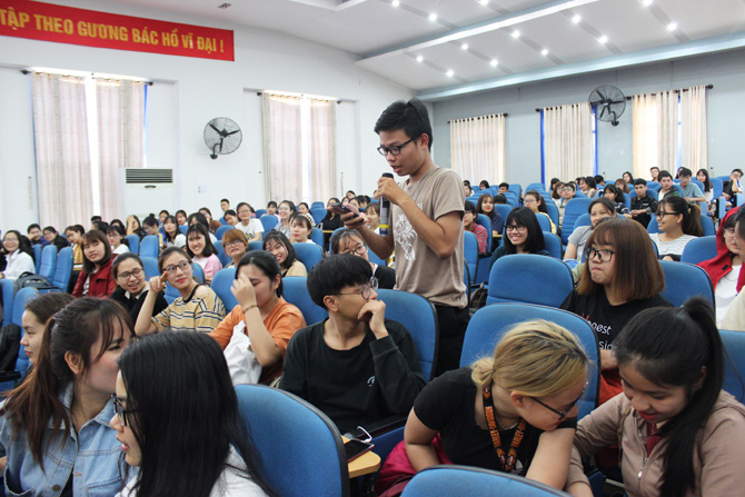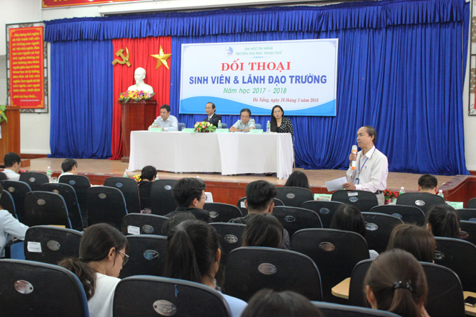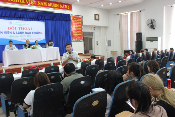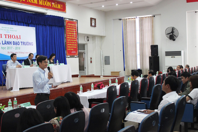 Nhằm tạo điều kiện để Ban Giám hiệu và lãnh đạo các đơn vị có cơ hội nắm bắt ý kiến của sinh viên về chất lượng các mảng hoạt động của Nhà trường trong năm học 2017-2018 cũng như trao đổi, thảo luận với sinh viên để tìm giải pháp phát huy những điểm mạnh, khắc phục những tồn tại tiến tới việc ngày càng nâng cao chất lượng giáo dục, chiều ngày 16/3/2018, Trường Đại học Ngoại ngữ - Đại học Đà Nẵng tổ chức buổi đối thoại giữa sinh viên và lãnh đạo Nhà trường.