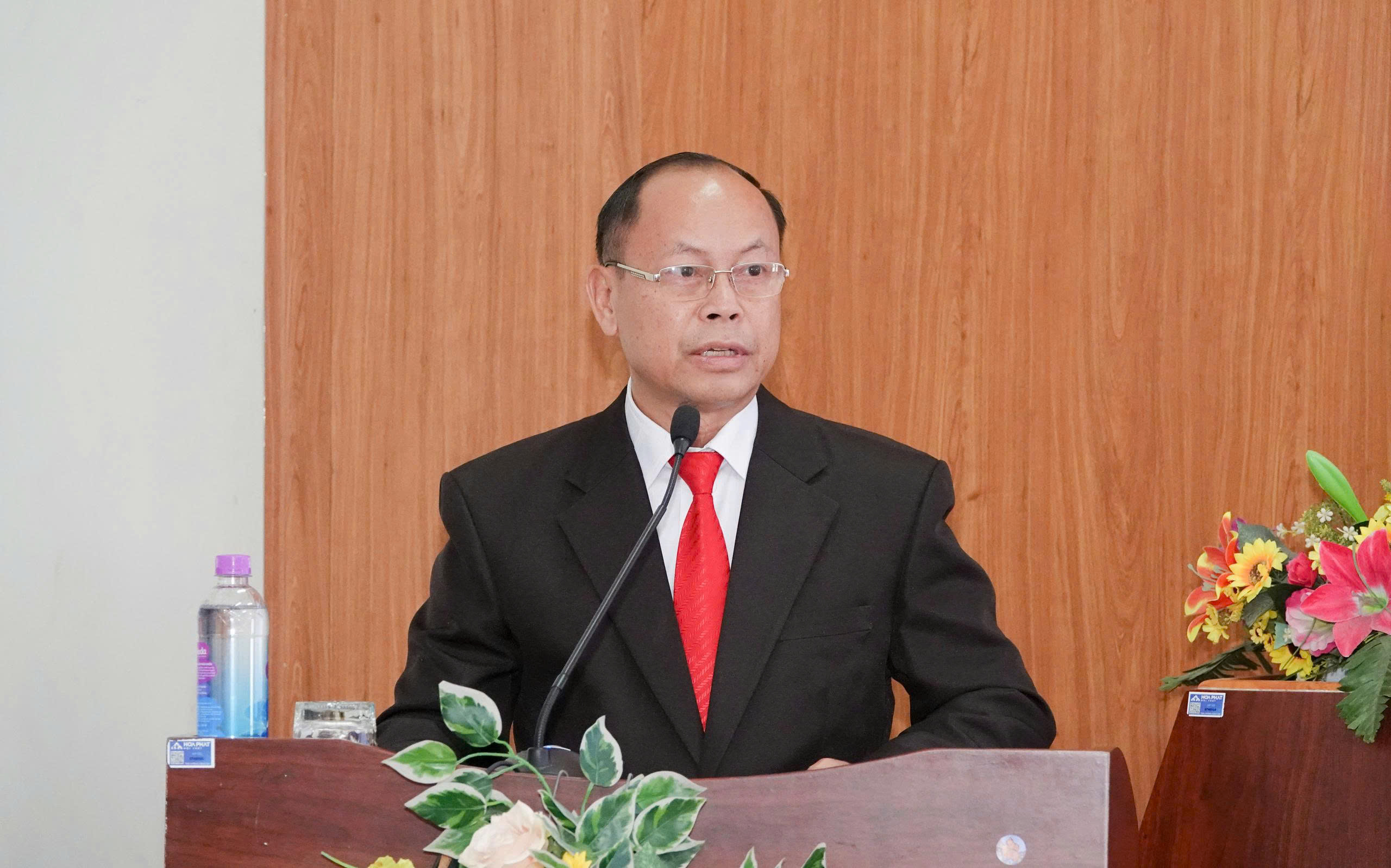 PGS. TS. Khanthaly Khamphilavong, Bí thư thứ nhất, Phòng Giáo dục và Văn hóa, Tổng Lãnh sự quán nước Cộng hòa Dân chủ Nhân dân Lào tại Đà Nẵng phát biểu tại buổi Lễ