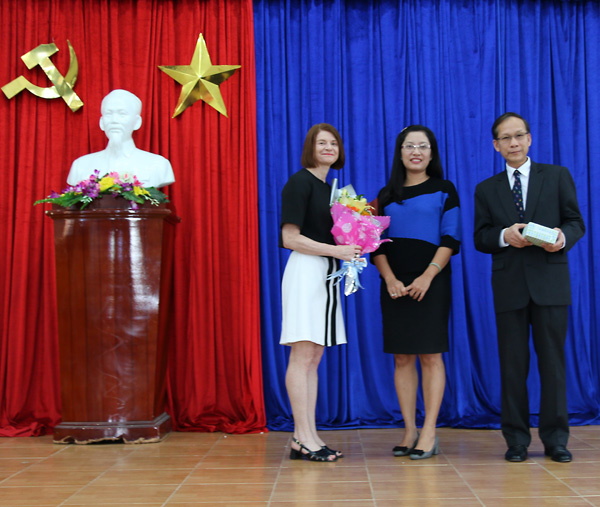 TS. Đào Thị Thanh Phượng - Phó Hiệu trưởng trường Đại học Ngoại ngữ, ĐHĐN tặng hoa và quà cho các chuyên gia.
