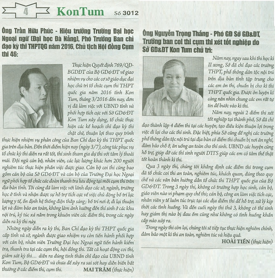 Qua 3 ngày thi, theo đánh giá của Hội đồng thi tại các cụm thi kỳ thi THPT quốc gia năm 2016 trên địa bàn tỉnh Kontum (Cụm thi 46, Trường Đại học Ngoại ngữ - Đại học Đà Nẵng), thí sinh được tạo điều kiện tốt nhất để bước vào phòng thi với tâm lý thoải mái, ổn định để làm bài thi đúng với năng lực, kiến thức được ôn tập trước đó. Theo nhận xét của đa số thí sinh, đề thi bám sát cấu trúc chương trình THPT và có sự phân hóa cao.