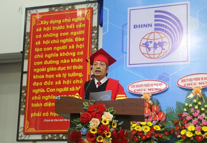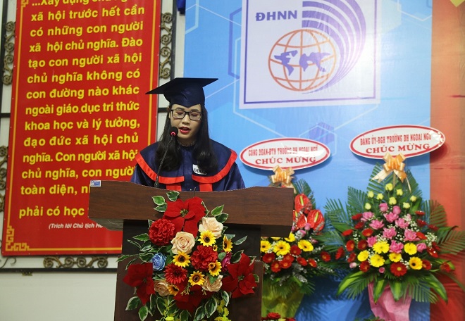 Trong niềm hân hoan, đại diện cho gần 900 học viên, sinh viên, Trần Thị Ngọc Huyền (lớp 16SPA01), sinh viên thủ khoa toàn trường bậc đại học hệ chính quy đã phát biểu, bày tỏ lòng biết ơn sâu sắc tới Ban Giám hiệu Nhà trường, tới các thầy cô giáo đã tận tình giảng dạy, chỉ bảo, truyền đạt cho các em những kiến thức, kỹ năng, giúp đỡ các em trong suốt quá trình học tập và xin hứa dù ở đâu, trên bất cứ lĩnh vực nào, các em sẽ luôn nỗ lực hết mình xứng đáng với truyền thống vẻ vang của Nhà trường.
