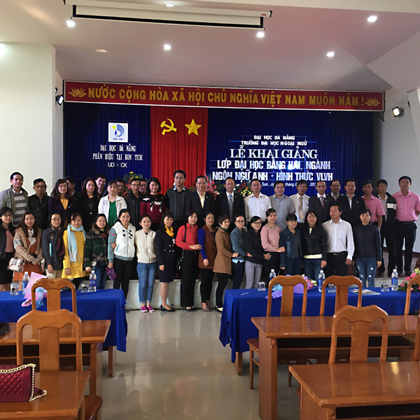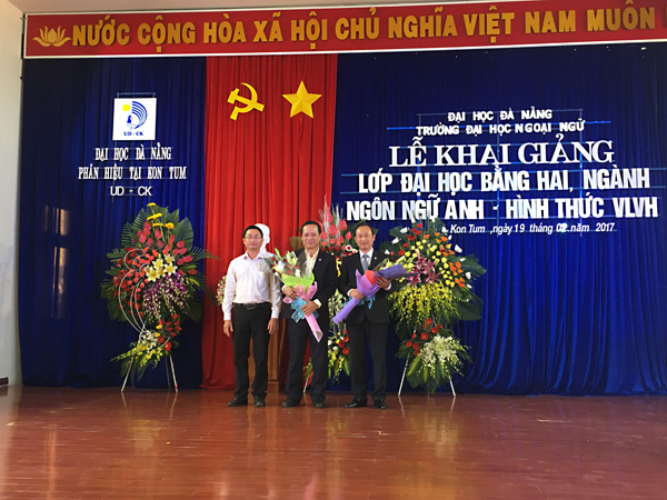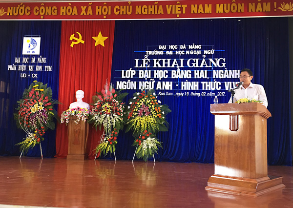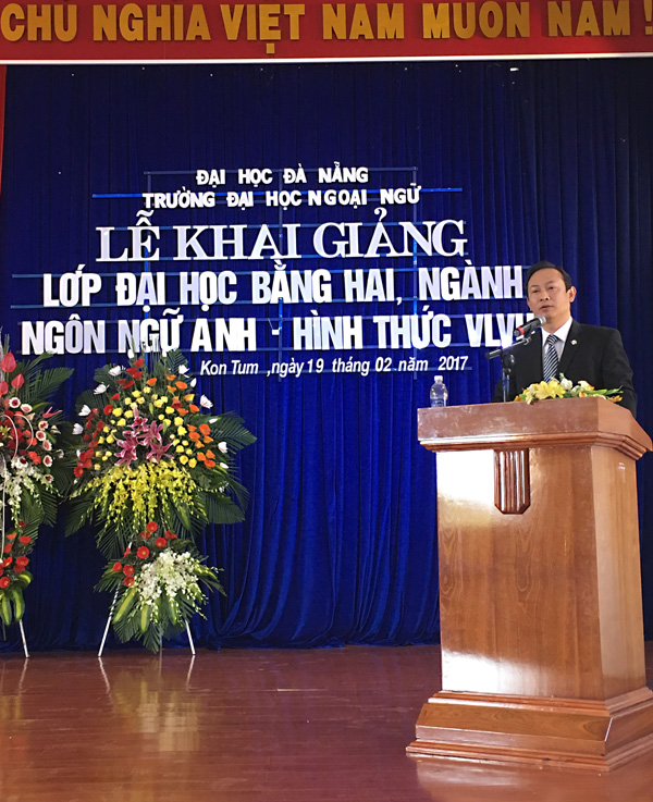 Tại buổi lễ, TS. Trần Hữu Phúc - Hiệu trưởng Nhà trường chúc mừng 72 học viên đã trúng tuyển và nhập học lớp Đại học bằng hai ngành Ngôn ngữ Anh theo hình thức vừa làm vừa học và nhiệt liệt đón chào sự có mặt của các tân học viên của lớp. “Đối với lớp đại học bằng hai ngành Ngôn ngữ Anh, hệ vừa làm vừa học, khóa tuyển sinh tháng 12/2016 tại Phân hiệu Đại học Đà Nẵng tại Kon Tum gồm 72 học viên trong đó 01 học viên được miễn thi và 71 học viên trung tuyển kỳ thi. Các anh, chị sẽ học 5 học kỳ trong vòng 2.5 năm. Tất cả các anh, chị đều đã tốt nghiệp một bằng đại học, đa số là cán bộ các sở, ban ngành, đơn vị, cơ quan trên địa bàn Kon Tum cũng như các địa phương lân cận và có anh, chị hiện và sẽ theo học chương trình cao học.”