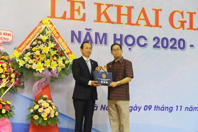 Đại diện sinh viên tặng hoa cho lãnh đạo Đại học Đà Nẵng và lãnh đạo Nhà trường
