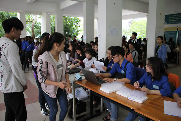 Ngay từ sáng sớm, đông đảo sinh viên Nhà trường đã xếp thành những hàng dài chờ đăng ký hiến máu. Trong những năm qua, hiến máu nhân đạo là hoạt động luôn nhận được sự quan tâm sâu sắc của Đoàn Trường cũng như của tuổi trẻ Trường Đại học Ngoại ngữ - Đại học Đà Nẵng.