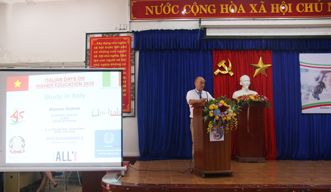 Ông Mariano Anderle - tùy viên Đại sứ quán Ý giới thiệu tổng quan về đại học Ý, về môi trường học tập, điều kiện xét học bổng, chương trình học và văn hóa của đất nước Ý dành cho du học sinh