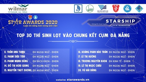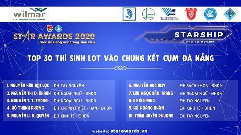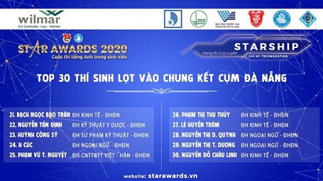 Tiếp nối thành công của những lần tham gia trước đây, từ cuối tháng 5/2020, sinh viên Trường Đại học Ngoại ngữ - Đại học Đà Nẵng đã tích cực hưởng ứng cuộc thi Tiếng Anh trong sinh viên – Star Award 2020 với hơn 3200 sinh viên đăng ký tham gia vòng thi online. Tối ngày 24/6/2020 ở nội dung phần thi Voice test, phần thi cuối cùng của Vòng thi online đã được tổ chức để chọn ra 30 thí sinh xuất sắc nhất trong hơn 15.000 thí sinh vào vòng chung kết khu vực diễn ra vào ngày 5/7/2020 tới đây. 14/30 thí sinh lọt vào vòng chung kết cụm Đà Nẵng là kết quả rất đáng tự hào của sinh viên Trường Đại học Ngoại ngữ - Đại học Đà Nẵng.