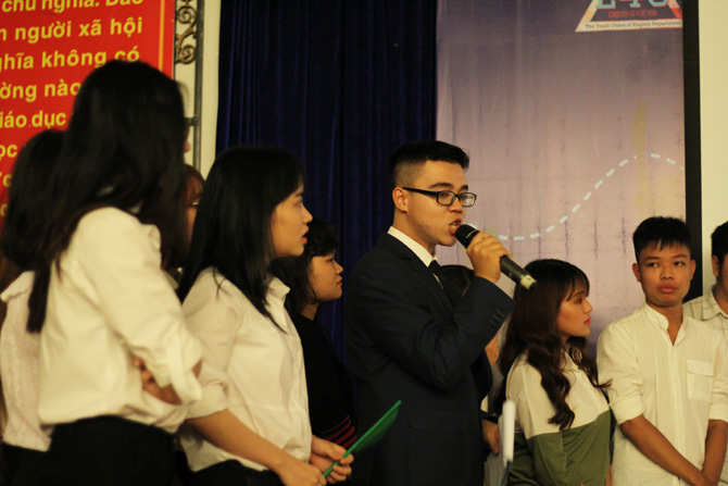 Tối 23/4/2017, đêm chung kết Cuộc thi hùng biện tiếng Anh “English Challenge 2017” đã diễn ra tại Hội trường A, Trường Đại học Ngoại ngữ - Đại học Đà Nẵng. Trải qua 2 vòng thi với nhiều cam go, thử thách, Ban Tổ Chức đã lựa chọn 15 gương mặt xuất sắc nhất của 3 đội xuất sắc nhất bước vào vòng chung khảo Cuộc thi hùng biện Tiếng Anh English Challenge 2017.