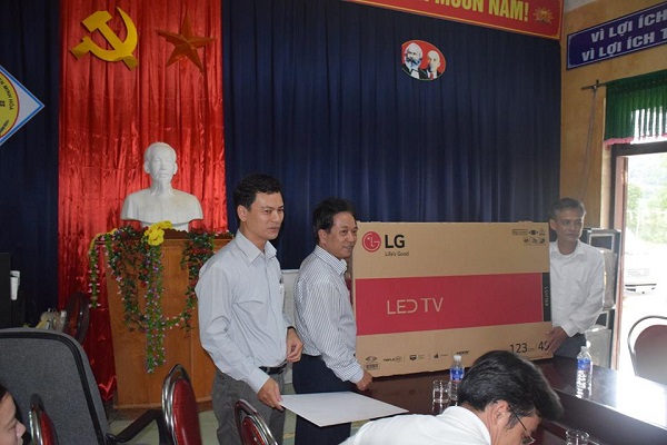 Đ/c Dương Quốc Cường và đ/c Nguyễn Đức Hùng đại diện Trường ĐHNN trao tặng 01 tivi trị giá 10 triệu đồng cho Trường TH&THCS dân tộc bán trú Trọng Hóa