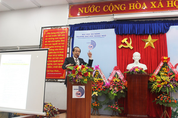 PGS.TS. Phan Văn Hòa - Nguyên Hiệu trưởng Nhà trường, người đã dày công lèo lái con thuyền Khoa Tiếng Anh vượt qua bao chặng đường khó khăn đã phát biểu ôn lại lịch sử phát triển Khoa tiếng Anh đồng thời bày tỏ lòng biết ơn sâu sắc tới các thầy cô giáo, những người đã đặt những viên gạch đầu tiên cho nền móng vững chắc của ngôi nhà Khoa tiếng Anh. Bài phát biểu đã khiến cả Hội trường như trở lại 30 năm trước, cùng sống lại vô vàn những khó khăn, thách thức mà Khoa đối mặt từ ngày đầu thành lập. Cũng qua những chia sẻ ấy, chúng ta càng thêm trân trọng, cảm phục sự tâm huyết, trách nhiệm và tầm nhìn chiến lược của Ban Giám hiệu Nhà trường và lãnh đạo Đại học Đà Nẵng đối với sự phát triển Khoa tiếng Anh Trường Đại học Ngoại ngữ - Đại học Đà Nẵng.