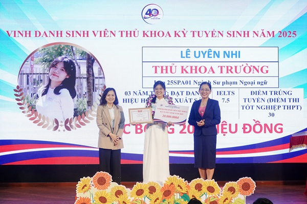 Năm nay, Nhà trường đã trao nhiều suất học bổng có giá trị: 20 triệu đồng cho thủ khoa toàn trường, 10 triệu đồng cho thủ khoa các ngành và sinh viên tuyển thẳng cùng 60 suất học bổng “Nâng bước sinh viên” với tổng giá trị 300 triệu đồng. Đặc biệt, chương trình còn chào đón 12 lưu học sinh quốc tế, khẳng định môi trường học tập đa văn hóa, hiện đại và hội nhập quốc tế của Trường Đại học Ngoại ngữ, Đại học Đà Nẵng.